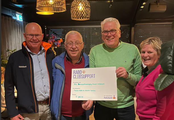De stemperiode van de Rabobank Clubsupport is al even achter de rug. Inmiddels zijn ook de stemmen gesteld en is het bedrag bekend. Egfried Booltink en Petra Brands overhandigden namens de Rabobank dit jaar de check met daarop het bedrag.